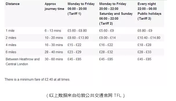 一个周末的中小型轿车租费在£70-80之间;出租车收费请看下图,三个字形容就是: 贵贵贵!嗯……起步价最低有£2.40,15分钟车程至少10镑吧~