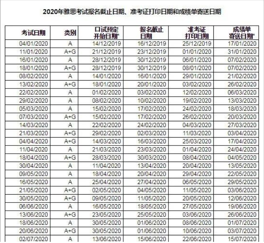 2020年全年雅思考试报名截止日期、准考证打印日期和成绩单寄送日期