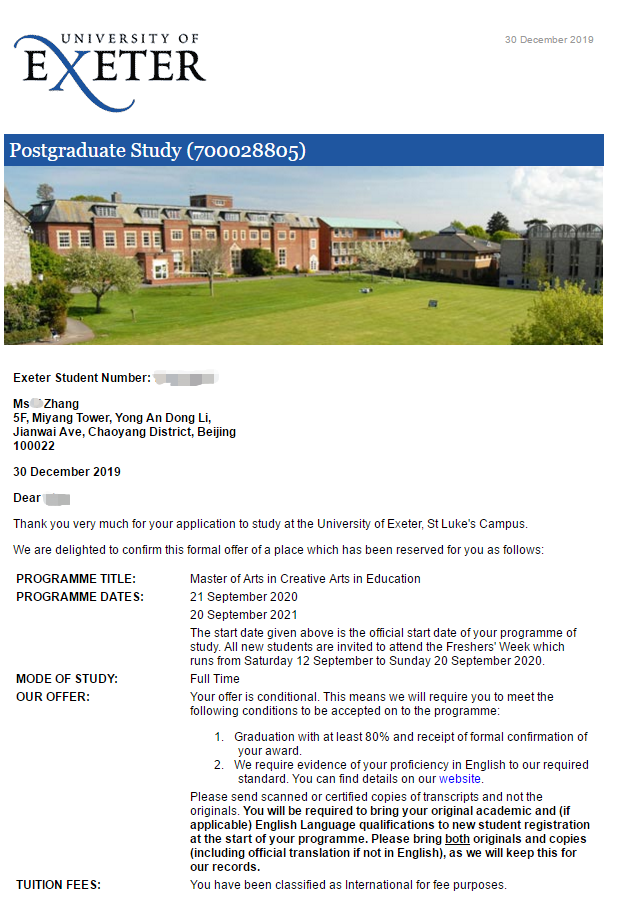 我们综合学生过往的实习,课外实践,挖掘了解到学生的背景跨专业能很好的衔接艺术教育类课程。重点在文书,对专业的理解,相关实践经历突出润色。最终获得Times英国排名12,世界QS排名154位--埃克塞特大学Master of Arts in Creative Arts in Eucation 创意艺术教育专业录取!
