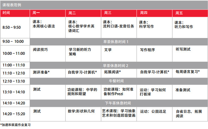 每周20小时的课堂学习和5个小时加强课程,10周一个级别,教科书为主的核心课程和英语8项分项教育法