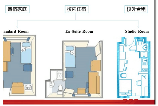 住宿方面,大学生一般不选 homestay。但学生公寓安全性好且环境好。英国的学生宿舍一般有4种基本房型,不过每个学校可能有稍许变化,不过万变不离其宗: