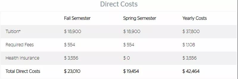 国际生学杂费方面,学校也给出了预估值,按照一学期9学分来计算的,一年预估学杂费42,464美元。