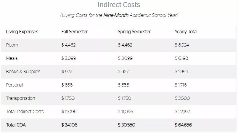按照一学年(9个月)的时间来算, 两个学期加起来的总成本(COA)约为64,656美元 。