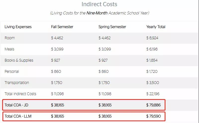注意:以上不包括放假来回机票钱,购买汽车的费用,其他娱乐费用等。 当然,法学院需要另算。据学校官网显示,法学院一学年的总费用在54,134美元, JD一学年COA约为79,886美元,LLM一学年COA约为79,590美元 。比普通研究生课程要贵1,000美元+。