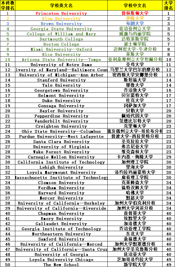 接下来首先让我们看一看 US NEWS本科教学TOP 50综合学校排名和 US News 本科教学 TOP 30文理学校排名。