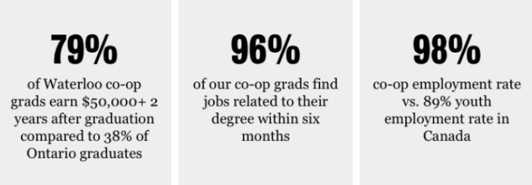 滑铁卢大学拥有全球最大的 Co-op 系统, 凭借着高就业率和高回报率的特点,Co-op已经成为加拿大最声名远扬的学业制度。