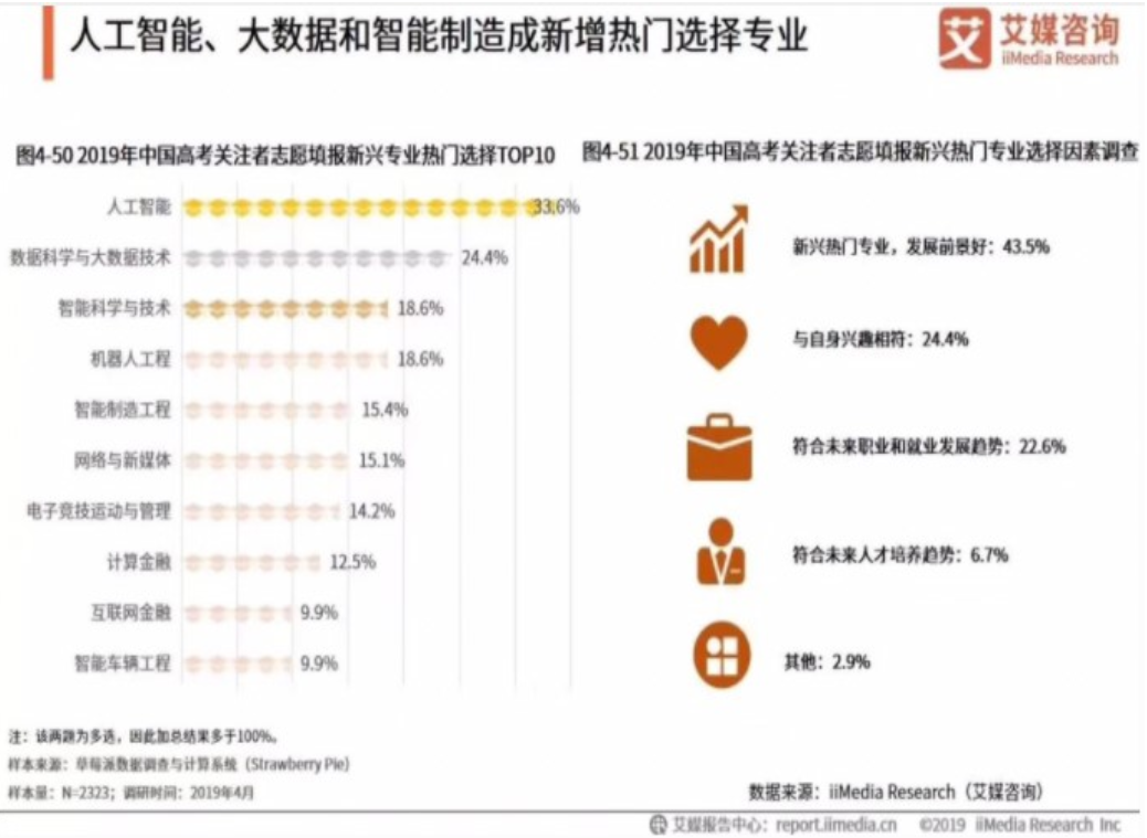 据艾媒报告 《2019中国高考志愿填报与职业发展趋势分析报告》数据显示,2019年中国共有196所高校新增备案数据科学与大数据技术专业,位列榜首,其次是机器人工程和智能科学与技术专业。大数据、人工智能与智能制造等工科专业正在成为高校培养人才的新方向。