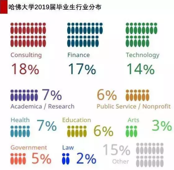 根据2019年哈佛校报披露的数据, 2019届毕业生未来会投身的行业分别是咨询(18%)、金融(17%)和科技(14%) ,这三大行业依然是最火爆的三大领域。 我们都知道,金融届以百万年薪让人实现自己人生的价值,以及回报了多年来辛勤学习的汗水。 但是在哈佛的毕业生去向调查中, 咨询行业却成为了最多人的选择。