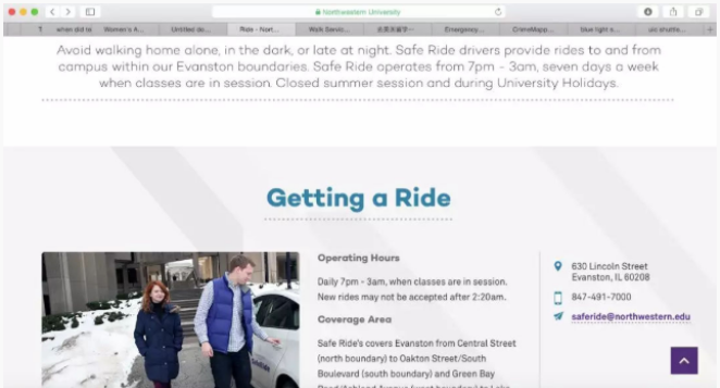 惊不惊喜、意不意外?优秀如西北大学,还有顺风车(Safe Rie)服务,也是免费的哦!为此西北大学还开发了一个软件叫做Transloc Rier App,每天的早上7点到深夜3点都会有顺风车服务,覆盖区域为北至Central St.,南至 South Blv./Oakton St.。工作人员大部分都是在校学生,顺路帮忙送同学回家,同时也算一份校内兼职,可以赚点零花钱。听西北小伙伴说,即使在图书馆熬夜到凌晨两点,在大埃村(Evanston) 也不怕打不到车!