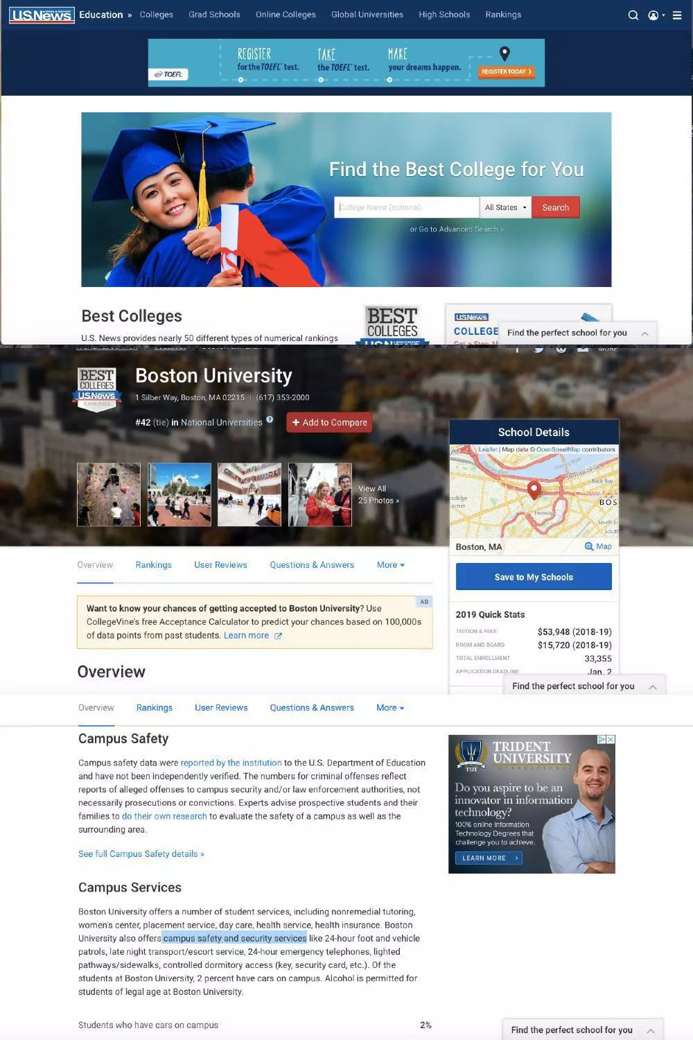 如果你刚来美国,还不知道大学周边的社区和居住的社区安不安全,有很多网站都可以查安全信息。比如上边这个链接里的网站就可以查询你所在的区域的安全指数。也有很多新生们现在不在美国,可以利用这个网站(https://premium.usnews.com/best-colleges)来查询自己心仪的大学有什么安全服务,比如要查波士顿大学,在网站首页输入波士顿大学(Boston University)后,会看到完整的学校信息。下拉到学校安全板块,便可以看到波士顿大学提供的安保服务,其中包含了很多上述已经提到的,还有照明人行道(这个也很重要,因为很多郊区的道路是不提供路灯的)、宿舍门禁(钥匙、安全卡等)。
