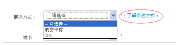 然后在“寄送方式”的下拉菜单里选择,不同方式的区别(包括范围、费用等)可点击