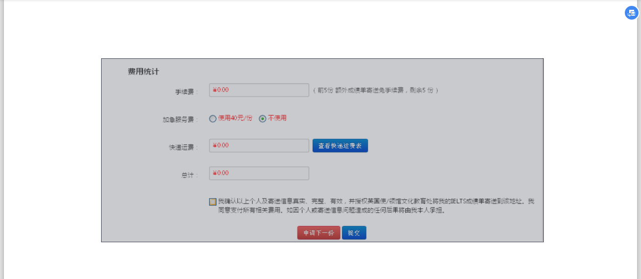 雅思系统会自动计算出送分费用。学生核对费用无误后点击“提交”