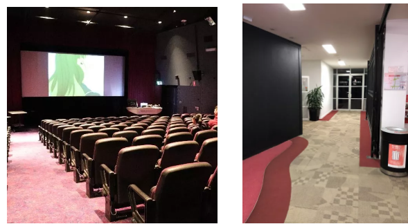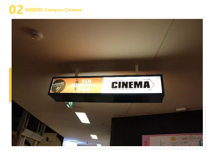 电影院门口贴着最近的排片表,大家可以根据上面的排片时间来安排自己的观影时间。电影院的墙壁上还贴有各种不同的怀旧经典电影的海报。校内电影院不算很大,但也可以容纳200人同时观影。