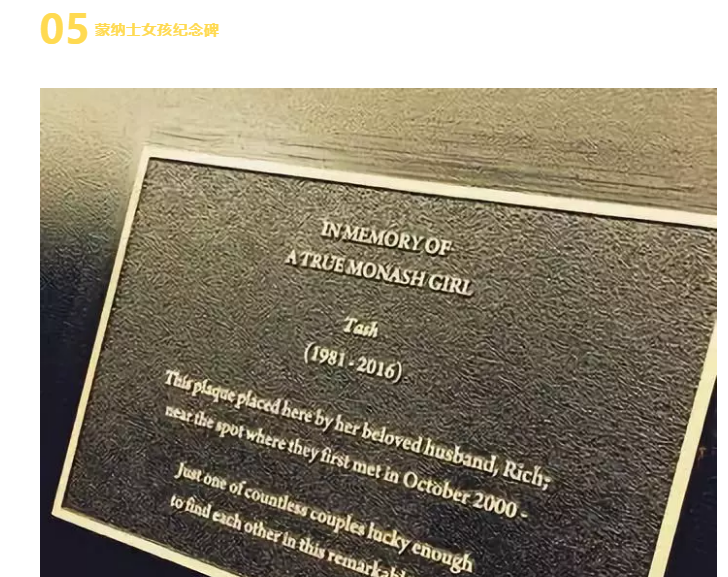 接下来要为大家介绍的是这块在 Clayton校区Campus Centre静静躺着的蒙纳士女孩 纪念碑,它是一段美好爱情的见证! 你可以看到上面的文字,这是Rich为了纪念过世的妻子Tash,在他们2000年第一次相遇的地方留下了这样的纪念。