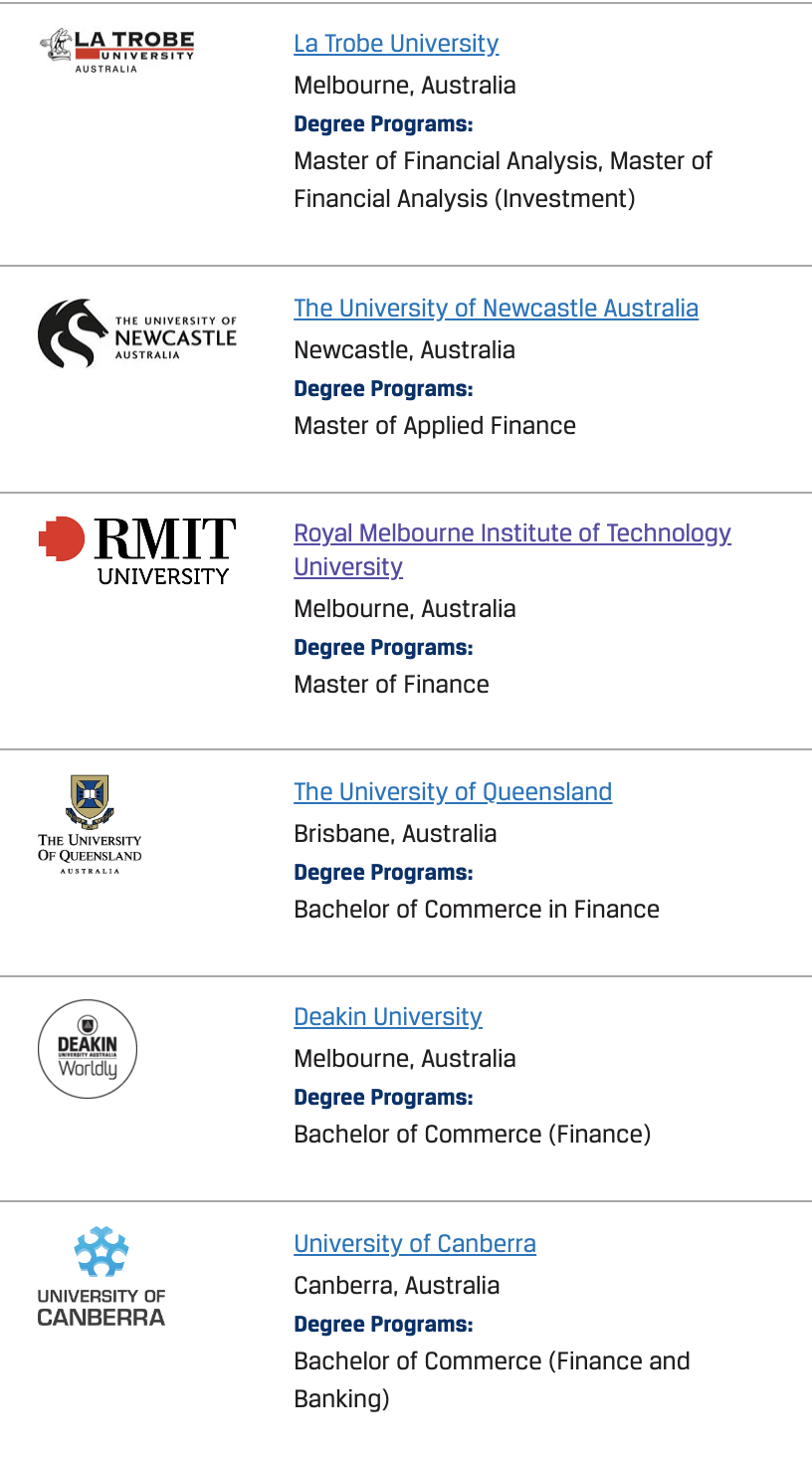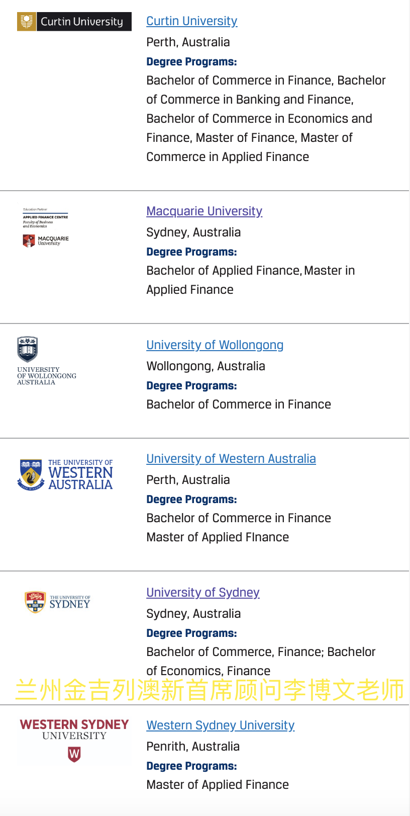 hi,大家好,给大家介绍下两部分:第一澳洲有哪些学校那些专业是有CFA认证的,第二认证的意义在哪里