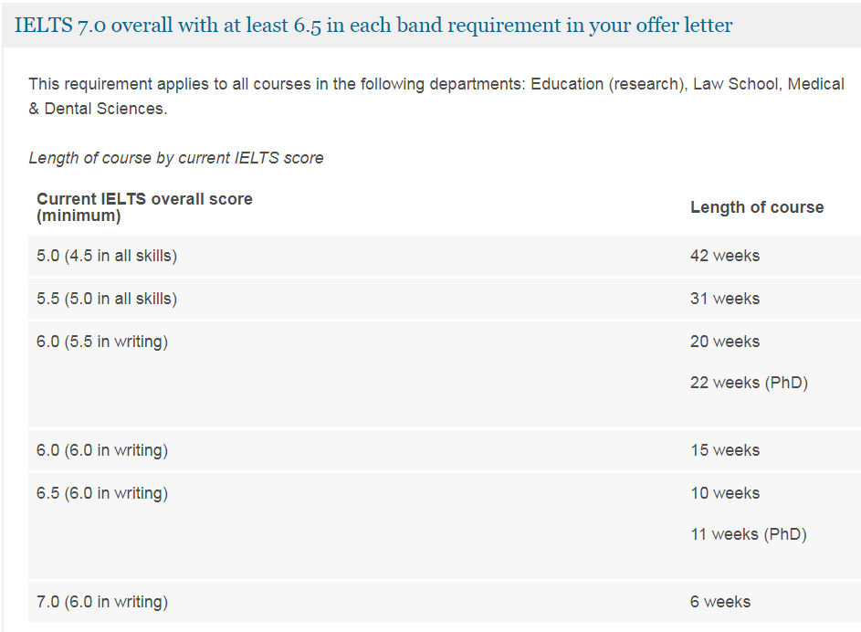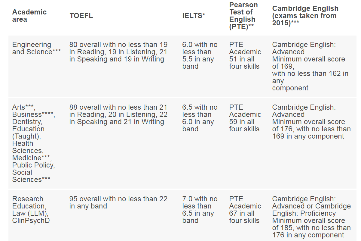 伯明翰大学为国际留学生对于本科和硕士都有提供相应语言课程,若是学生没有达到本科或硕士直入的语言要求可以配相应的语言课程,下面小杨老师就带大家看一下对于本科硕士伯明翰大学要求的语言成绩以及没有达到要求可配置的语言课程有哪些。