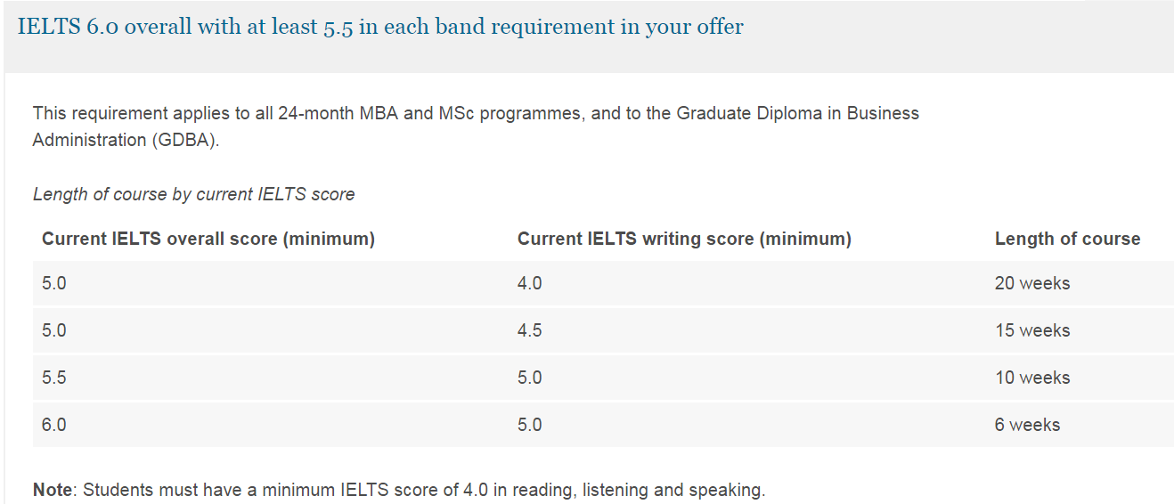 直入专业要求雅思6.0单项不低于5.5,适用于所有24个月的工商管理硕士和硕士课程,也适用于工商管理研究生文凭(GDBA)。