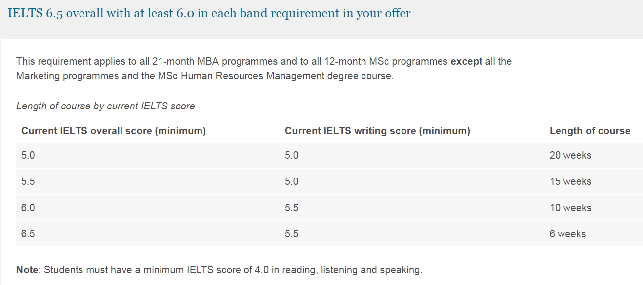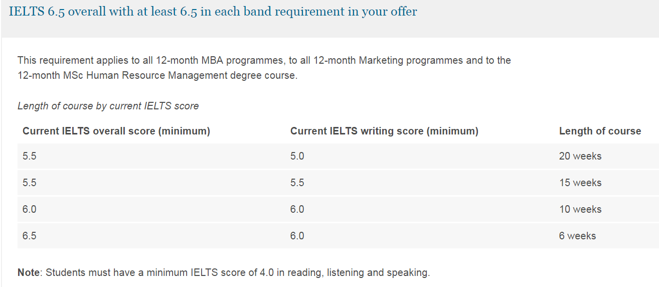 直入专业要求雅思7.0,单项不低于6.5,适用于所有12个月的MBA课程、所有12个月的营销课程和12个月的人力资源管理硕士学位课程。
