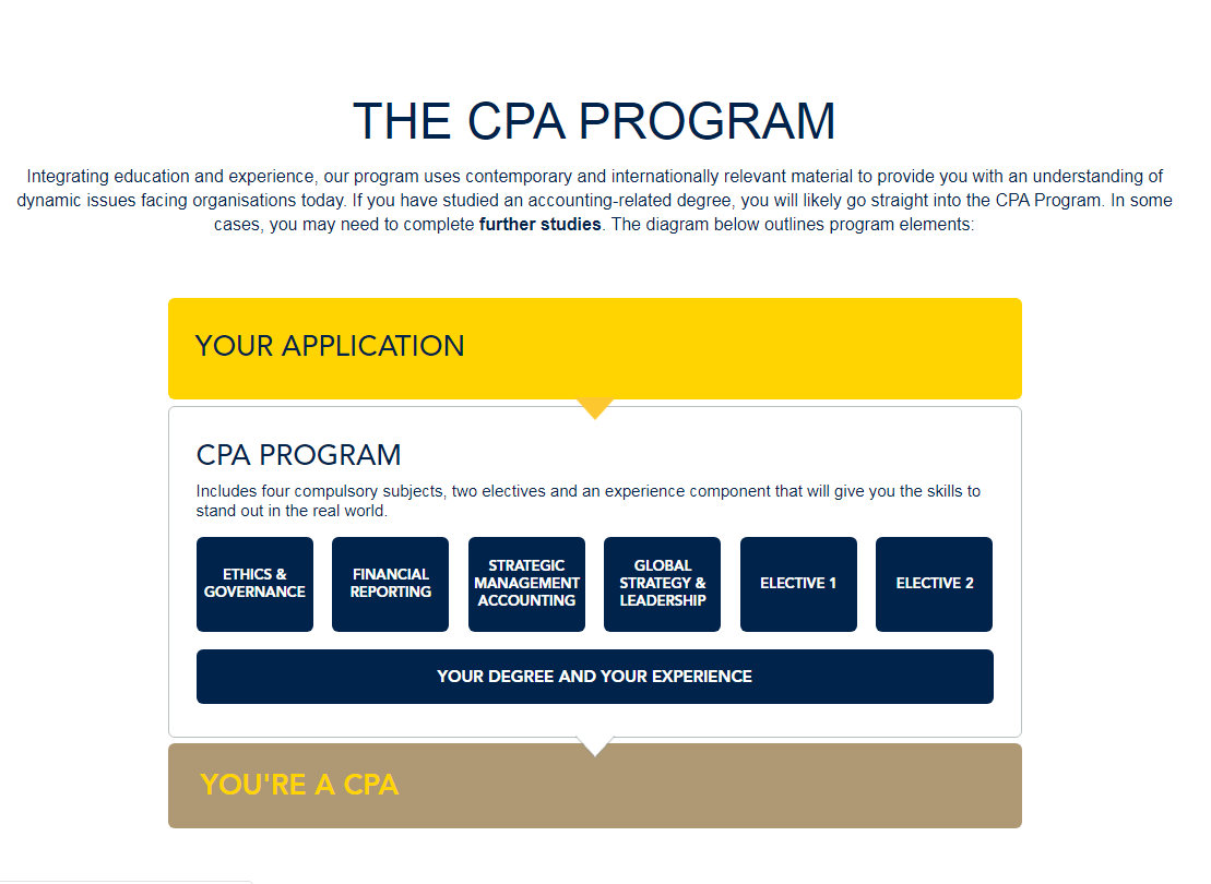 对于本科专业是会计的毕业生来说,既可以选择Master of Professional Accounting专业,又可以选择Master of Commerce Accounting专业。如果选择前者,则与非会计背景的学生规划相同。如果选择Master of Commece专业,可以学到更深层的商科及会计知识,但是选课时需要特别注意是否能够满足CPA基础课程Founation Level的要求。如果选择的课程没有涵盖所有CPA基础课程的话,则毕业后需要经过额外的考试才能申请成为Associate并且进一步参加CPA专业课程的学习和考试。