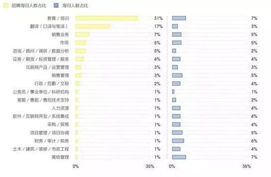 • 据报告显示,海归的就业岗位与所学专业的匹配度有所提升。这是因为在经济全球化的今天,越来越的岗位开始与国际接轨,避免了留学生所学专业与国内岗位不相关、不匹配的情况。