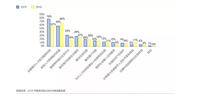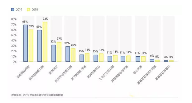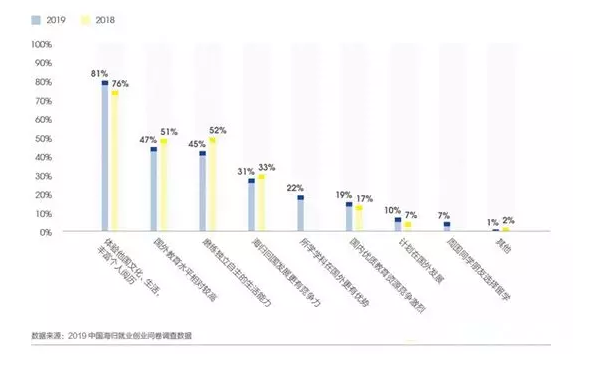 这确实是吸引海归们的三个因素之一,但令人惊讶的是,选择“回乡”的留学生数量正在攀升,占比从 2018年的 9%提升至 2019年的 30%,增长 21个百分点。