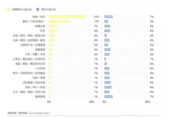 • 据报告显示,海归的就业岗位与所学专业的匹配度有所提升。 这是因为在经济全球化的今天,越来越的岗位开始与国际接轨,避免了留学生所学专业与国内岗位不相关、不匹配的情况。