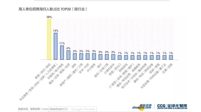 • 从用人单位对海归的需求状况来看,教育行业是对留学生需求量最大的一个领域,占比 38%,因为在这个领域中,海归的优势主要集中在语言方面。教育培训行业对留学生的偏好则反映了这一行业在国内的迅速发展和巨大的人才缺口。