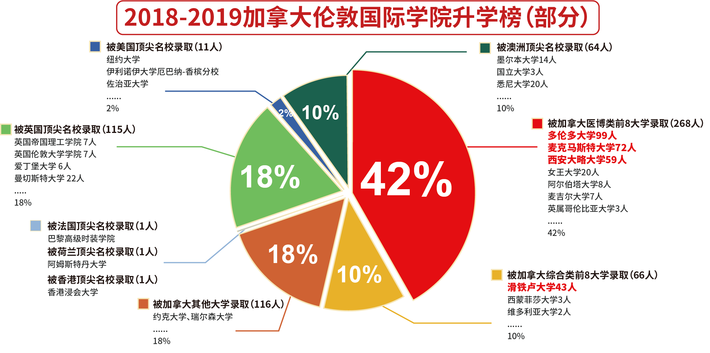 100%大学升学率,85%毕业生升读加拿大前8或世界前100名校,60%学生获得大学奖学金。LIA重视学术,竞赛成绩突出,连续多年在加拿大数学竞赛、物理竞赛等大赛中取得优异成绩