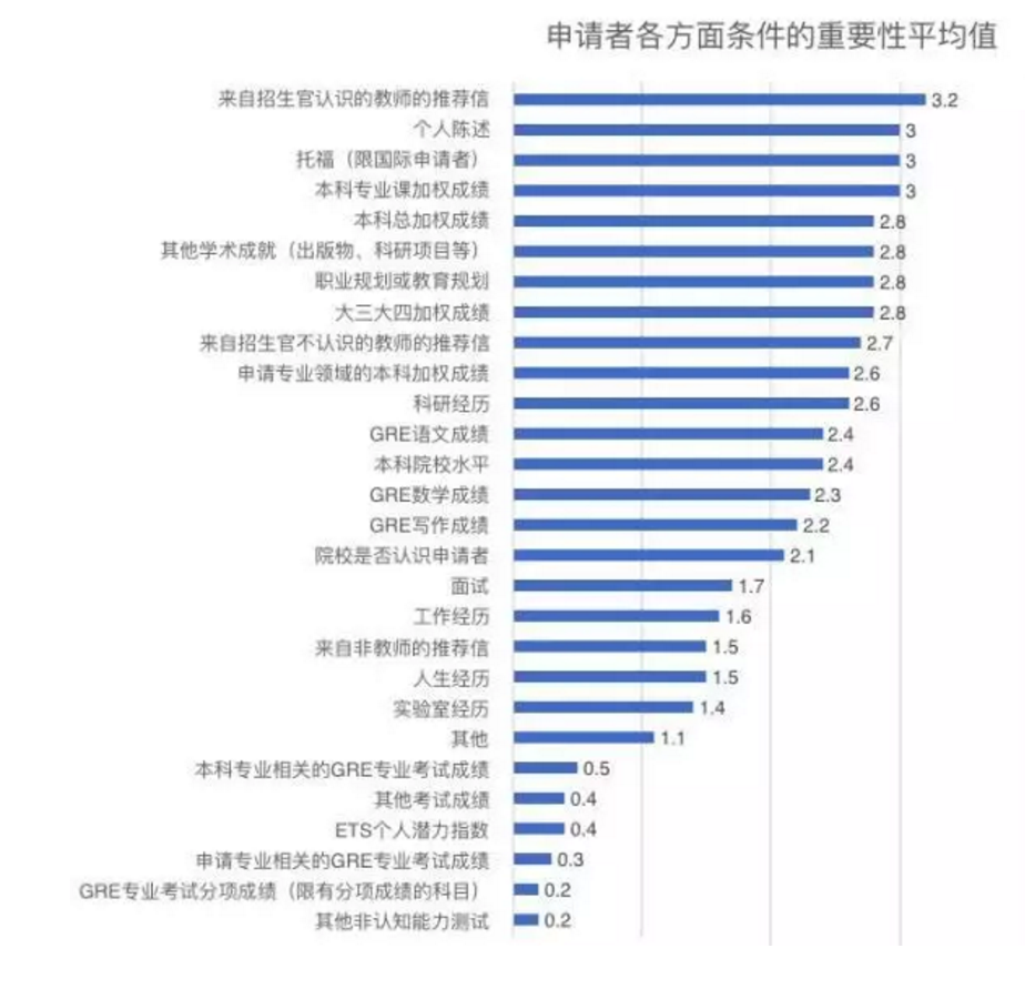 ETS曾经对留学申请中的各项条件在留学申请中所占的作用做出过调查,在这项调查中总共收集到31所院校、不同专业共计163份有效问卷。
