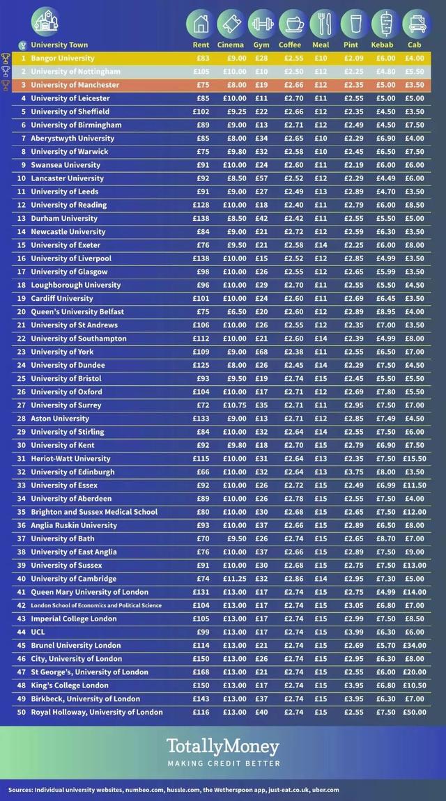 英国 Totally Money 网站贴心地为那些想要“节俭”的学生,制作了一份“2019英国最省钱大学排行榜”,这份榜单从4大方面、8个标准来评价英国大学的生活成本: