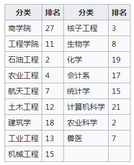 2016年版的U.S. News & Worl Report排名中,该校的石油工程与农业工程分别为全美第二以及第四,包括航天、机械、土木、工业工程等工程领域皆能排进全美20强 :