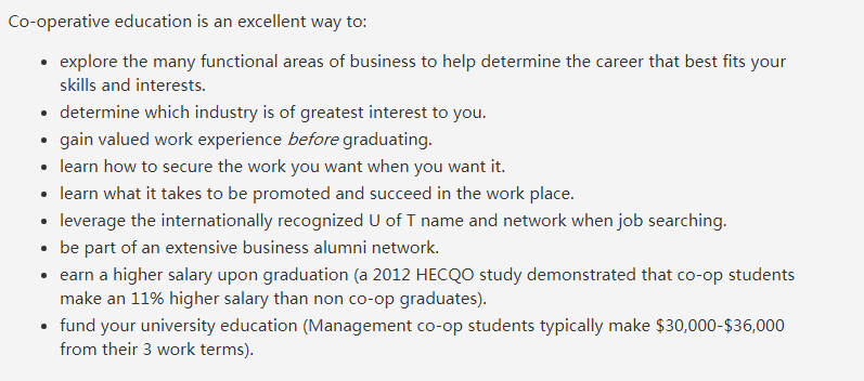我们经常说加拿大本科大学80%都有带薪实习(co-op),那么究竟Co-op带薪实习的课程有什么优势?下图为多伦多大学--商科co-op的截图优势:
