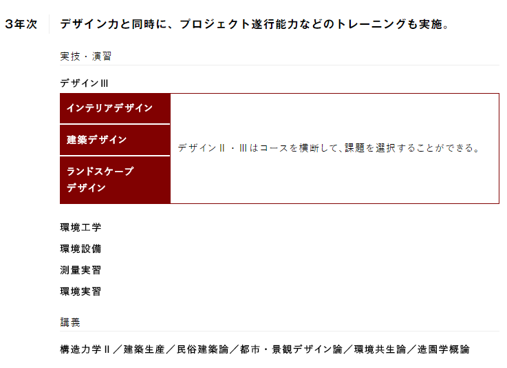 第一年将了解整体环境设计。学生将学习手工设计和计算机设计的基础知识。第二年和第三年分为“室内”,“建筑”,“风景”三个课程,并且学习更加专业的内容。但是你可以自由选择挑战,你可以选择出适合你的课程。在第四年每位教员的监督下,学生将进一步探索并进行毕业工作。无论学生选择哪种课程,都有资格参加全国考试,如建筑师全国考试。接下来我们就来详细看看环境设计的课程设置是怎样的吧!