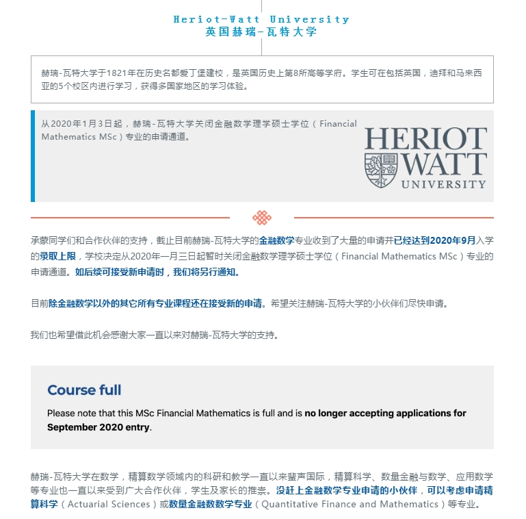 英国赫瑞-瓦特大学官宣:从2020年1月3日起,赫瑞-瓦特大学关闭 金融数学 理学硕士学位(Financial Mathematics MSc)专业的申请通道。