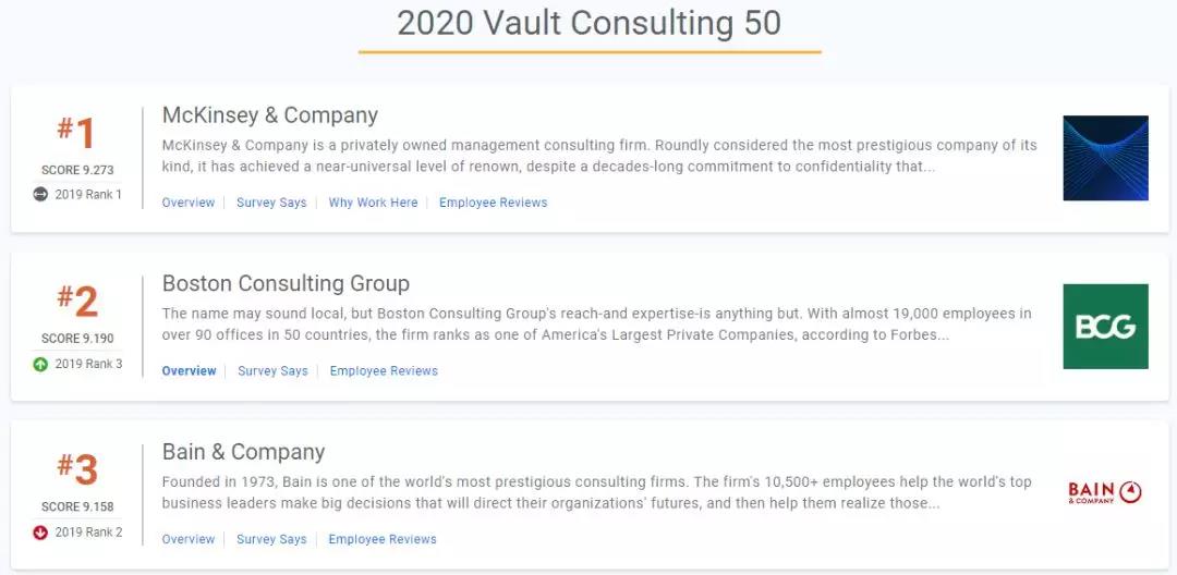 在Vault 2020榜单中,麦肯锡再次夺冠,波士顿第二,贝恩第三。作为咨询领域的龙头老大,麦肯锡已经连续多年位居第一,其位置已经变得愈发无法撼动。