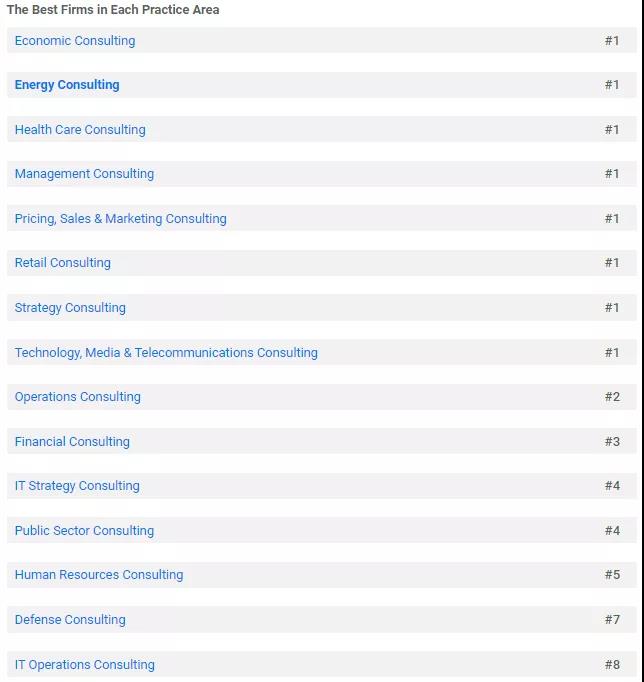 在本次排名的15个行业评估中,麦肯锡拿下其中八个咨询第一,分别是经济、能源、医疗、管理、市场定价、零售、战略以及技术媒体。更重要的是,麦肯锡在全球咨询领域的声誉也是NO.1!