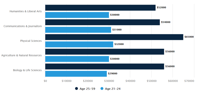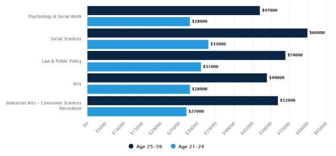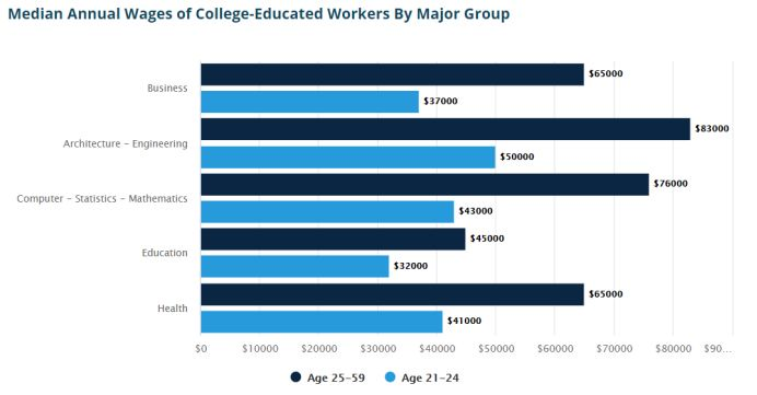 (上表显示了15个主要专业领域中21-25岁和25-29岁大学毕业生的年薪中位数)