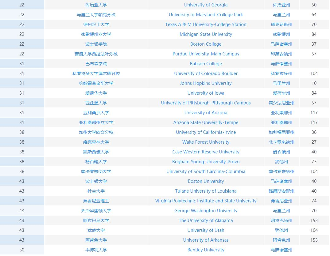 从上面的表格来看,本科商科排名在整体上跟大学的综合排名成正比,不过也有特殊,比如德州大学奥斯汀分校和印第安纳大学伯明顿分校。