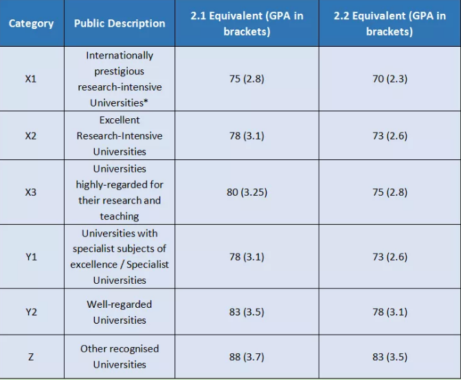 要求2:1学位的专业,针对Tier 1A/Tier 1B, Tier 2, Tier 3 的均分要求分别是75分、80分、85分,要求2:2学位的专业,针对Tier 1A/Tier 1B, Tier 2, Tier 3 的均分要求分别为70分、75分、80分。