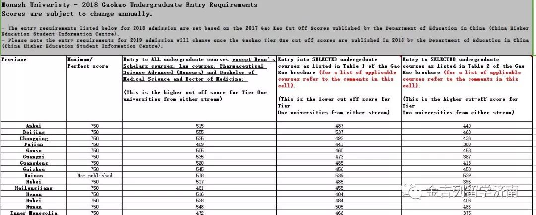 上图 给大家列举一下莫纳什大学 2018年审理组依据2017年高考成绩做的高考录取要求 (2018年实时更新信息请致电咨询哟~)