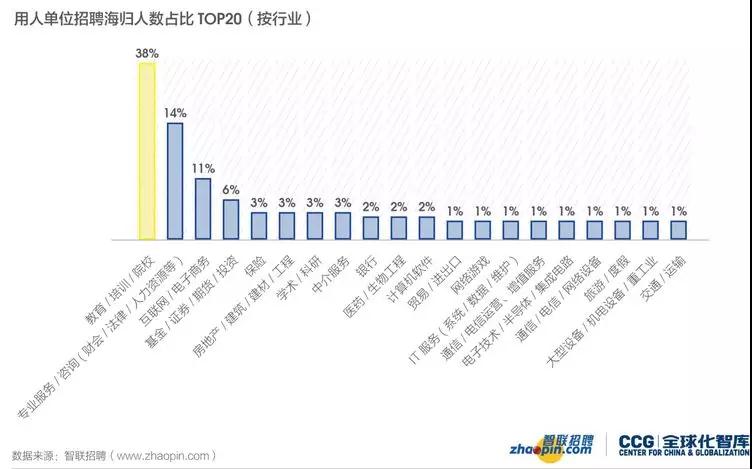 • 从用人单位对海归的需求状况来看,教育行业是对留学生需求量最大的一个领域,占比 38%,因为在这个领域中,海归的优势主要集中在语言方面。教育培训行业对留学生的偏好则反映了这一行业在国内的迅速发展和巨大的人才缺口。