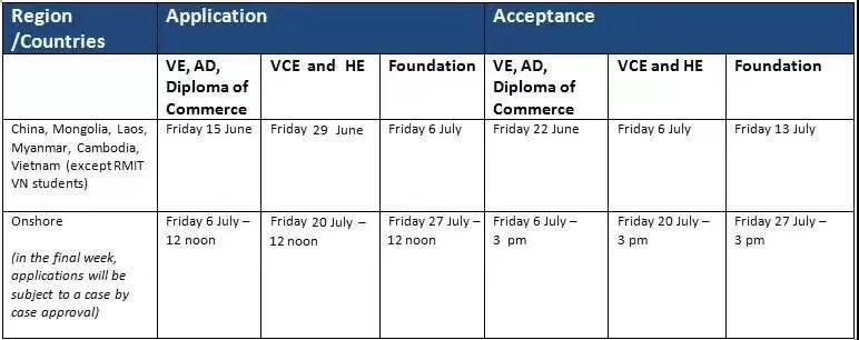 中国学生和Onshore学生申请(Application)和接受(Acceptance)的截至日期如下:
