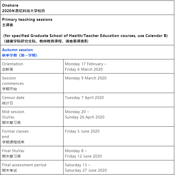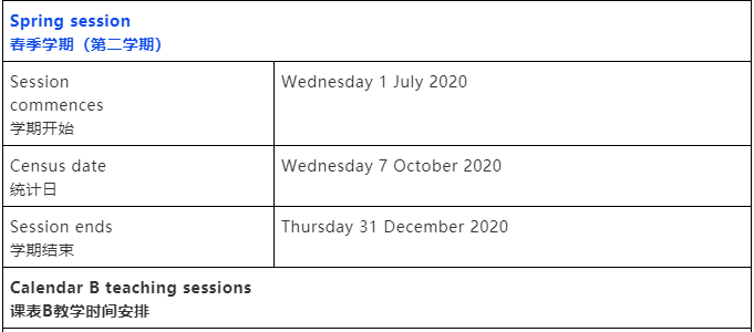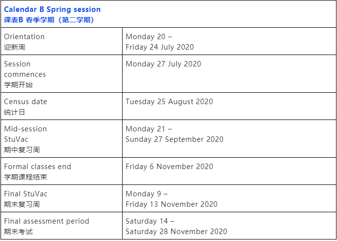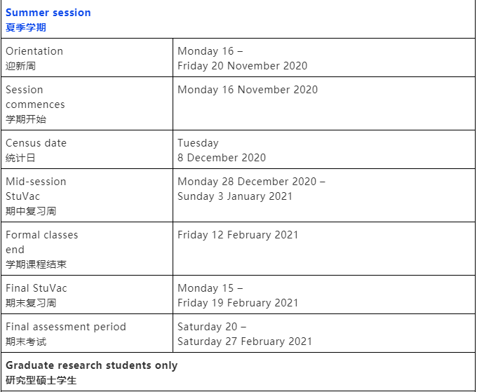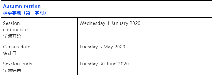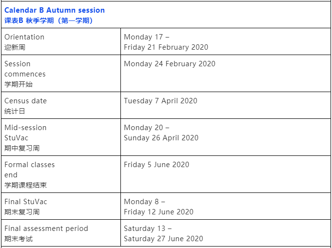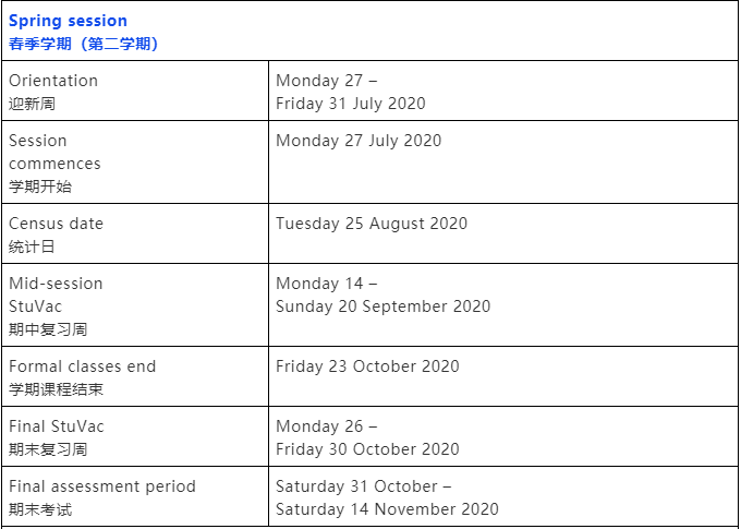 注: 1. Census Date一般是可以撤销已选课程的截止日期,同时也是学生支付学费的最后期限。超过这个时间,有可能需要支付一定费用进行相关操作 2. 具体日期可能会根据各院系安排有所调整 3. 在此也给即将来到澳大利亚的新同学温馨提示一下,因为澳大利亚地处南半球,所以季节和北半球有所不同,大部分地区(除热带北部)的季节划分为: