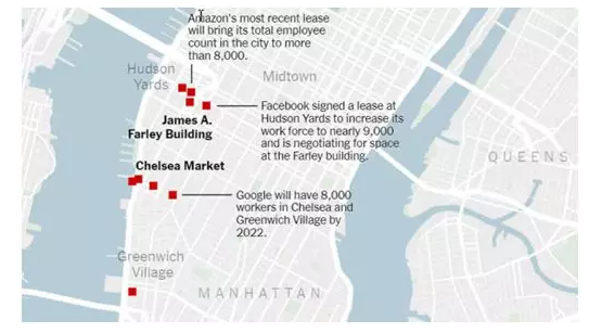 只有扎克伯格吗? 当然不是,想要在纽约排兵布阵的还有电商巨头亚马逊。 据了解,此前放弃皇后区的亚马逊在去年 12 月又重新签下了曼哈顿西侧的一栋办公楼。