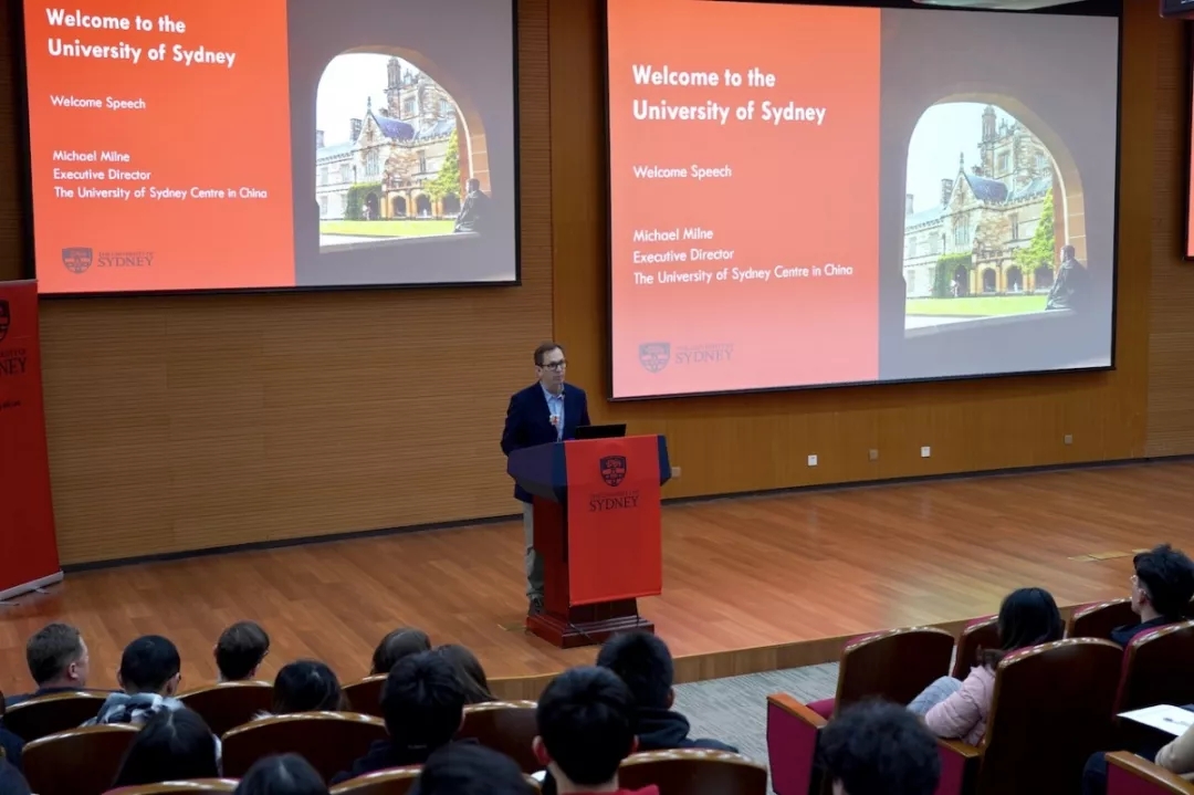 悉尼大学中国中心 主任宓迈克先生首先欢迎了近2 00 位 “ 准留学生 ” 及家长参加上海行前说明会并致欢迎词。