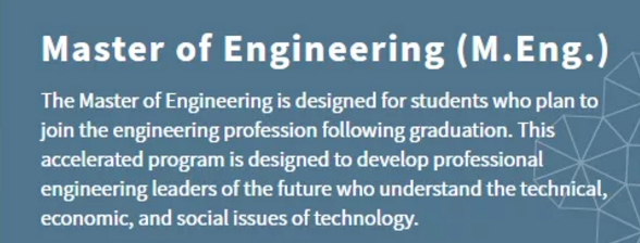 Master of Engineering(MEng)项目是职业类型,培养目标是就业导向,培养学生各种技术知识和技能,为工业界输送人才。