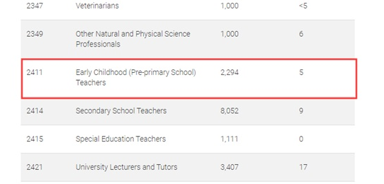 解析:虽然Early Chilhoo Teacher, 2019-2020年度,移民局只发放了2294个配额,但是截止到2019年10月11日,只用掉了5个名额。主要原因是,幼教在做职业评估的时候,英语需要雅思8877这个硬性条件,并且各大学在招收学生的时候,英语要求一般也是要达到雅思四个7以上(大多数学校可以用PTE的成绩作为入学标准,PTE相对于雅思要拿分很多)。因此,很多学生面对语言这块,有点望而却步,实际入读这个专业的学生,并不多。总体来说,幼教这个职业,它的移民名额还是非常充足的。
