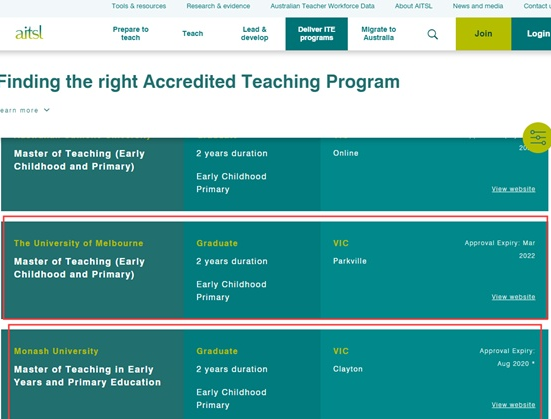 另外,从移民局官网,同学们也可以了解到,幼教专业是需要读受AITSL机构认证的,才能移民。从以上AITSL 官网截图,我们可以看到读墨尔本大学和莫纳什大学的幼教硕士,是受AITSL 认证的。因此,选择这两所学校,毕业后,有符合要求的语言成绩,是可以顺利进行教师注册和进行职业评估的。