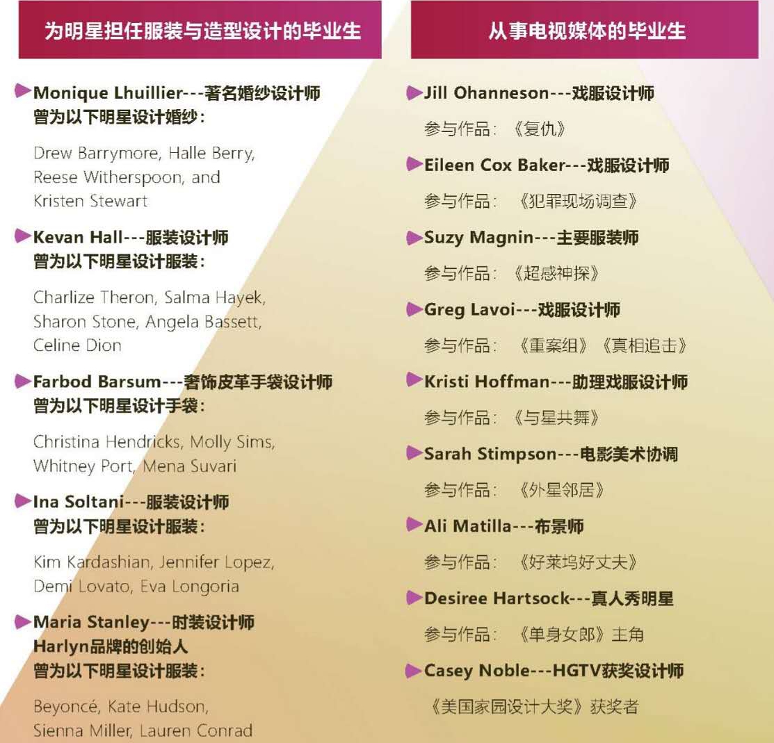 作为一所专门培养时尚、设计与娱乐产业精英创意人才的学校,FIDM拥有25个以上热门专业与全球时尚、设计、娱乐、传媒和创意生活等产业密切相关。过往毕业生的职业发展多种多样,有的晋身为美妆产业的行政高管、市场经理、运动品牌设计师,纺织制造商,有的为艾美奖和奥斯卡获奖影视节目担任舞台服装设计,也有更多的学生成立了他们自己的时尚与设计品牌 。FIDM与众多娱乐产业巨头有密切合作关系。连续25年,每年均有奥斯卡获奖电影的剧服在FIDM校区展出。此外, 美国知名时尚设计真人秀节目《天桥骄子》(Project Runway)的多位获奖参赛者皆来自于FIDM, 将其在时尚设计方面的声誉扩展到全球领域。