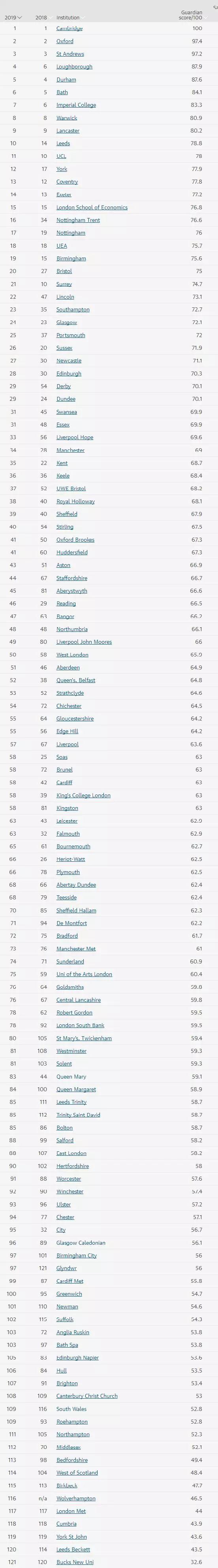 英国当地时间5月29日,英国《卫报》2019年大学排行榜(University league tables 2019)新鲜出炉了, 121所英国大学上榜! 今年的排名情况如何?有哪些变化呢?